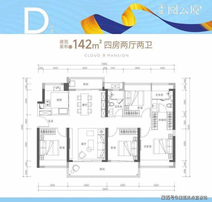 142㎡的4房2厅2卫,(D户型,1栋2单元05户型)设计的是竖厅南北通透格局,客厅4米开间,四开间朝南,双阳台设计,4个卧室分别做到了3.6米/3.3米/3米/2.8米的宽度,主卧大套房设计,客厅连接次卧出7.3米长的大阳台,U型厨房,得房率75-77%(不含赠送),大阳台主朝东南朝向。