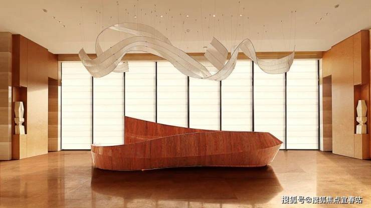 天花板上,则是如飘带般的巨型吊灯如灵动的音符般翩翩起舞,这是由旧金山著名玻璃艺术家尼古拉斯·温斯坦倾力打造的“舞动的音符”,宛如被时光雕琢的艺术珍品,寓意欢迎业主归家。