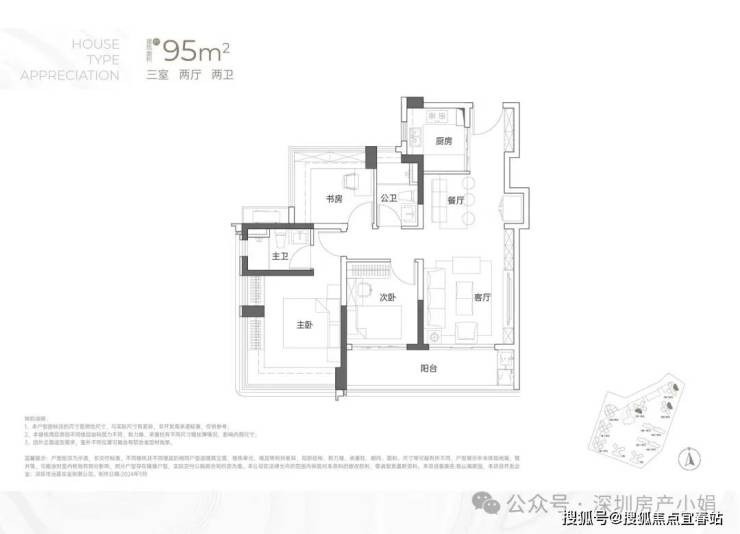 主力户型解析:95-138㎡全能3-4房,适配全家庭需求建面约95㎡ 三房两卫• 格局:传统竖厅设计,南北通透,空间利用率拉满,得房率约95%-97%。• 亮点:3.5米客厅开间,搭配6.3米宽大阳台(连通客厅与次卧),晾晒、观景两不误;主卧与次卧配备270°全景飘窗,东北向享大南山景,西南向望小区花园。