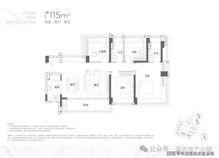 建面约115㎡ 四房两卫• 格局:横厅设计,三种户型贴合不同朝向,南北通透无遮挡,赠送率居首。• 亮点:餐客厅一体化,30㎡阔绰公共空间,搭配超大景观阳台;四开间朝南,全屋采光均匀,主卧套房设计,私密度拉满。