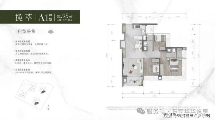 1号楼B1户型设计独特,两条腿朝向不同,西北向和西南向均有分布。虽为竖厅设计,但实现了四开间布局,一侧多个飘窗,采光极佳。户型灵活,可作三居室或四居室。打掉次卧,客厅可变宽敞大横厅,开间超6米,豪宅风范尽显。唯一遗憾是仅有一个阳台,一条腿朝北,在东莞多雨天气可能晒不到太阳。