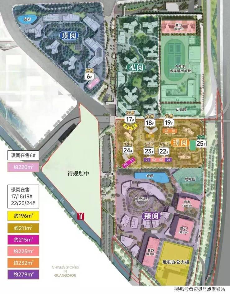 整个琶洲南TOD项目分两期开发,一二期总共将规划建设26栋楼,其中一期总共约1500户由16栋住宅和1栋公寓组成,一期已经有部分楼栋已经收楼,二期总共约600户由8栋住宅和1栋公寓组成,并配建托儿所、幼儿园以及中小学等。