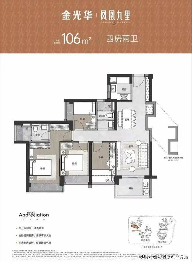 106㎡的4房2厅2卫,设计的是竖厅格局,S墙设计预留冰箱位,四开间朝南,U型厨房,客卫三段式分离设计,西南朝向。