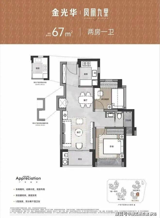 67㎡的2房2厅1卫,设计的是竖厅格局,S墙设计预留冰箱位,U型厨房,卫生间三段式分离设计,东南朝向。