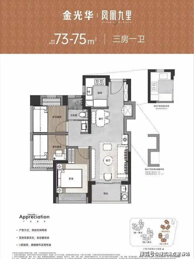 85㎡的3房2厅2卫(01.07户型),设计的是竖厅南北通透格局,主卧双飘窗设计,U型厨房,客厅阳台主朝西北、东北向。