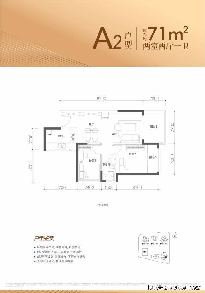 设计的是竖厅格局,客厅3.2米开间,进深8.2米,LDKB一体化设计,2个卧室分别做到了主卧12.5㎡/次卧9.12㎡(包含墙体飘窗),U型厨房,卫生间干湿分离,得房率约79%(不含赠送),东南朝向.
