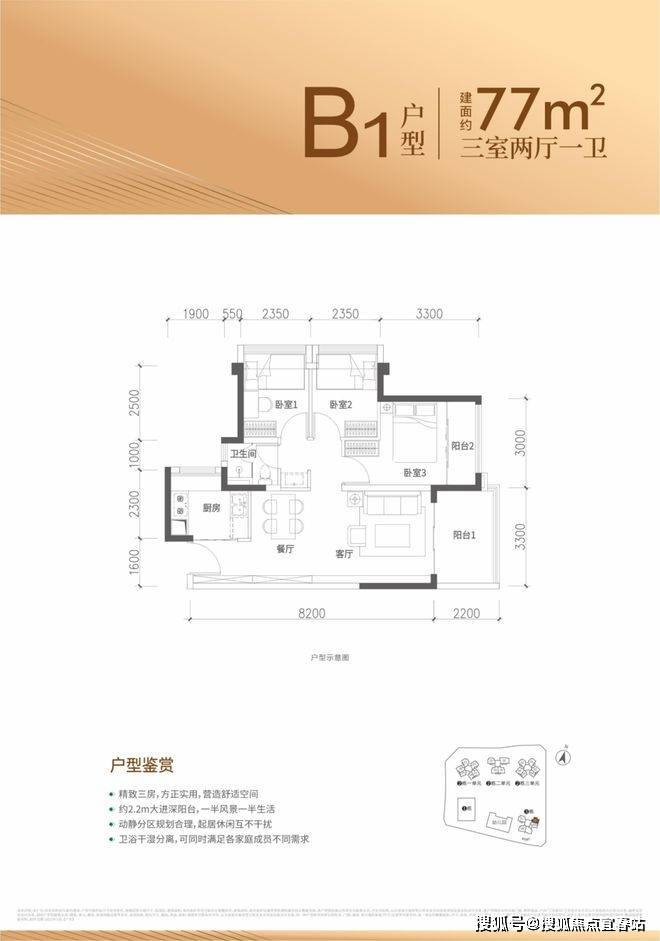 设计的是竖厅格局,客厅3.3米开间,进深8.2米,LDKB一体化设计,3个卧室分别做到了主卧11.3㎡/次卧7.28㎡/次卧7.28㎡(包含墙体飘窗),U型厨房,卫生间三段式分离,得房率约79%(不含赠送),东南朝向。