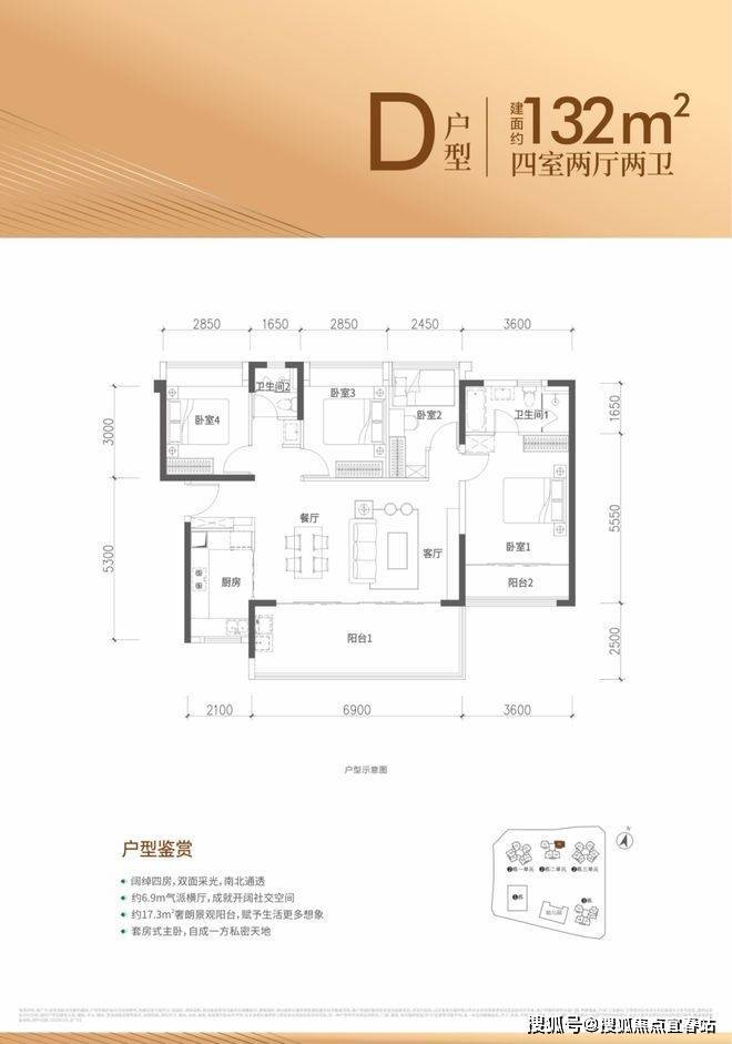设计的是横厅南北通透格局,客餐厅6.9米开间,LDKB一体化设计,四开间朝南,4个卧室分别做到了主卧19.98㎡/次卧10.26㎡/次卧10.26㎡/次卧8.82㎡(包含墙体飘窗),U型厨房,公卫三段式分离,得房率约79%(不含赠送),阳台主朝正南向。