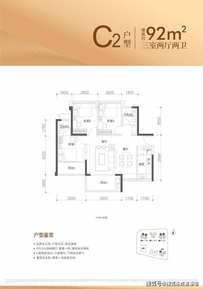 设计的是横厅南北通透格局,客餐厅5.6米开间,LDKB一体化设计,四开间朝南,3个卧室分别做到了主卧12.43㎡/次卧9.22㎡/次卧8.84㎡(实测面积,去掉墙体飘窗),U型厨房,公卫三段式分离,得房率约79%(不含赠送),阳台主朝西南或东南向。靓点都不需要睡飘窗。