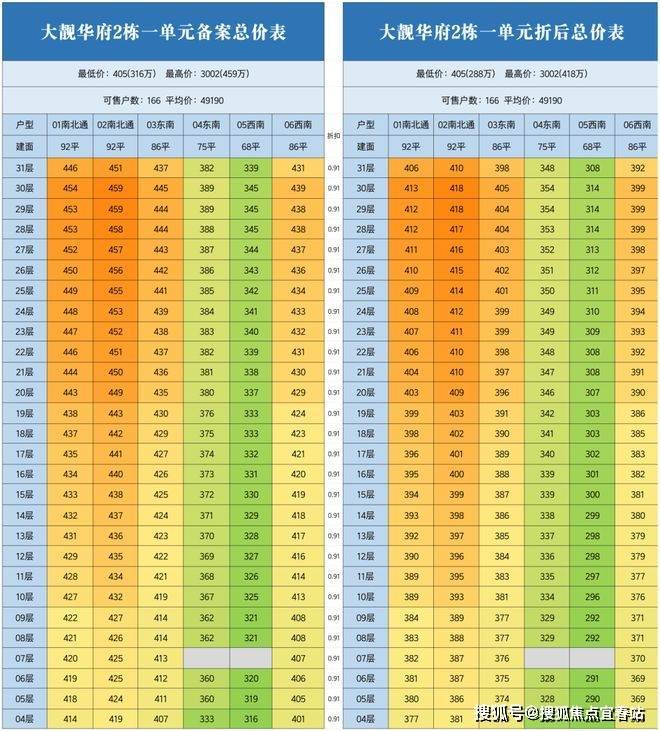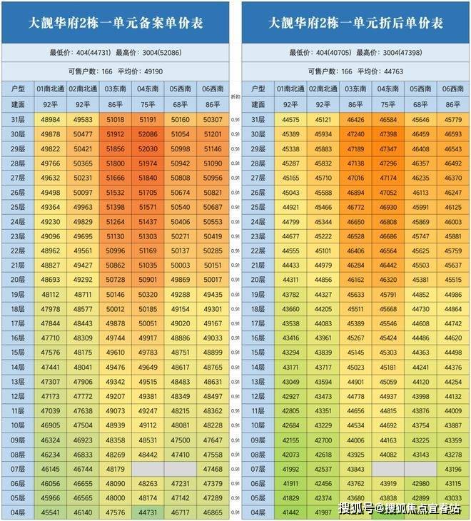 大靓华府开盘首推的2栋1单元,开盘打出了9.1折的综合折扣优惠,折后均价4.48万/㎡,折后单价4.07-4.73万/㎡,总价在287-418万/套。