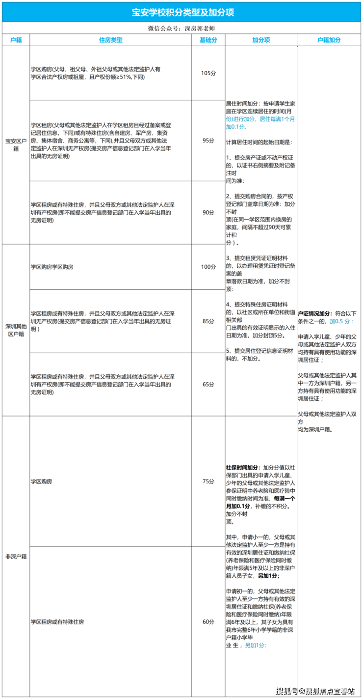 按照宝安区教育局公布的积分政策,只要是深圳户籍(其它区)+学区内商品房,基础分100分,深圳宝安户籍+学区内商品房,基础分105分。