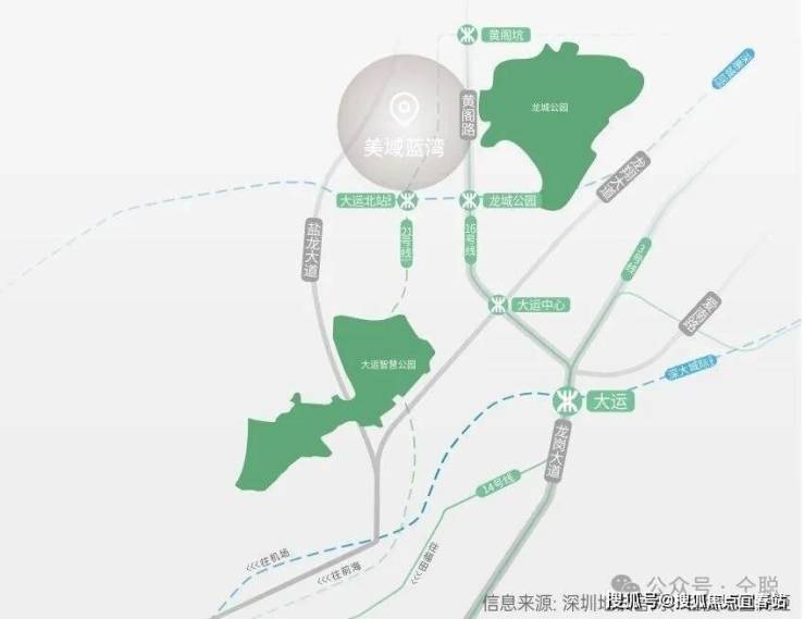 超核枢纽 速链大湾区地铁:直线距离16号线龙城公园站约800m,两站直达大运枢纽站,接驳3/14号线和深大城际(建设中);直线距离21号线大运北站(规划中)约600m;快速连接全城。城际:直线距离深惠城际大运北站(在建中)约600m,未来4站深圳北站、8站前海中心;路网:龙飞大道、龙翔大道、盐龙大道、龙岗大道、水官高速、沈海高速、武深高速、外环高速、南坪快速。