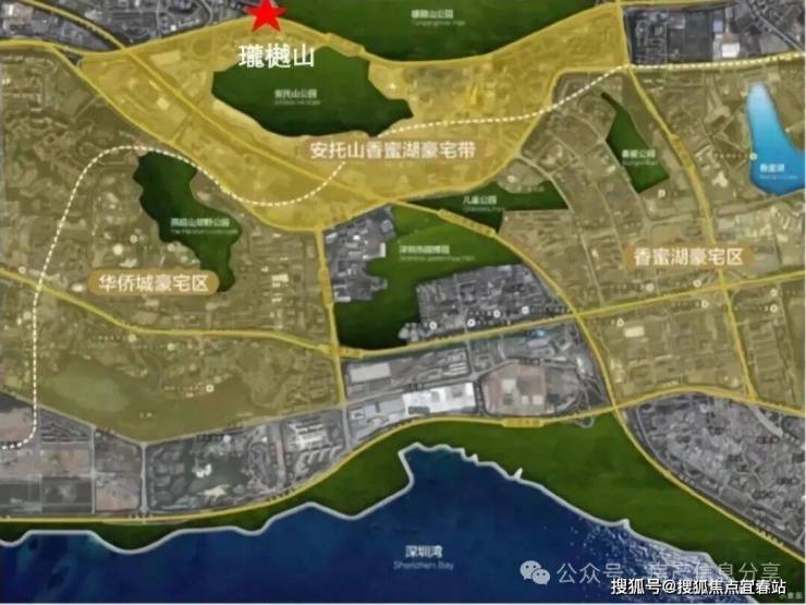 珑樾山所在的安托山板块,左手牵华侨城,右手连香蜜湖,在两大深圳众所周知的“豪宅区”中间。※项目位置示意图※