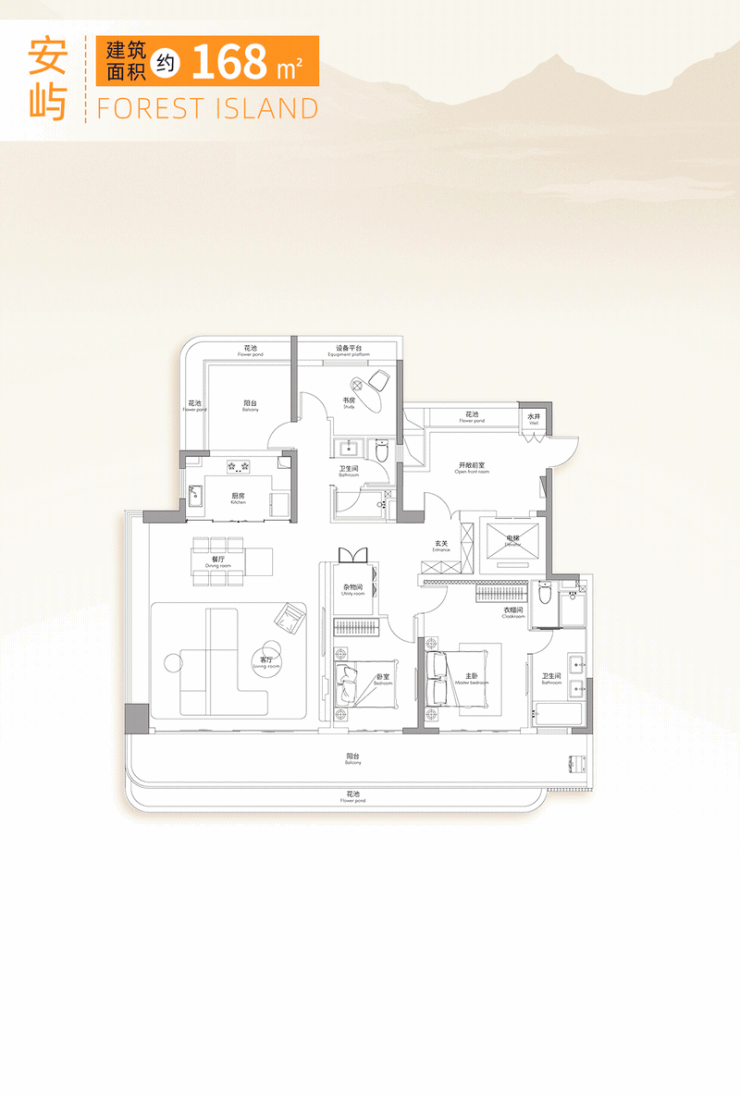 其中最引人注目的是168㎡户型,拥有约15.6米南向巨幕观景阳台,从客厅一直延展至两个卧室,真正做到整面墙体向绿海打开。主卧配置独立入户动线、双面采光、步入式衣帽区,以及浴缸+双洗手台+明卫设计。