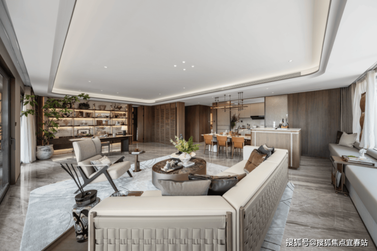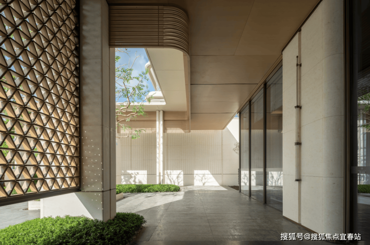 建筑立面:采用大面积玻璃幕墙,细节处点缀香槟色格栅,简约大气。灵感来源于游艇线条,呈现出“流线型”的柔和曲面,消弭了建筑与自然之间的割裂。