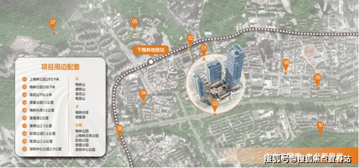 「商业配套」:项目自带2-3层配套商业,步行范围内有梅林商圈,10分钟车 程可达福田CBD 商圈、华强北商圈。