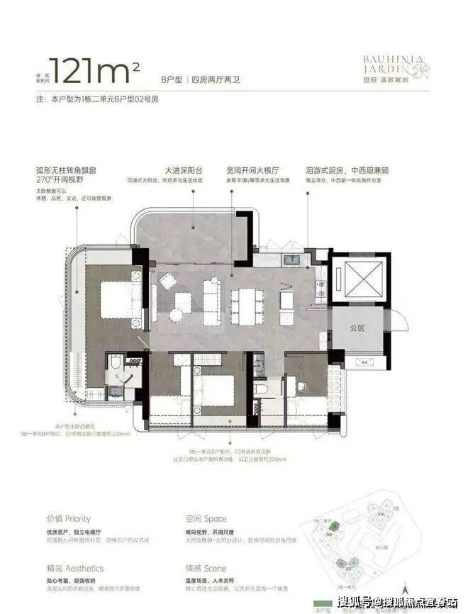 从空间布局来看,U 型厨房的设计极为人性化,大开间客厅与宽阳台是整个户型的最大亮点,西南向视野使得整个户型采光充足,贯通式阔景阳台与客厅、卧室双通,极大地拓展了生活空间的宽度。主卧的飘窗台也是一大亮点,弧形无柱转角飘窗不仅提供了广阔的视野,还增加了室内的采光。