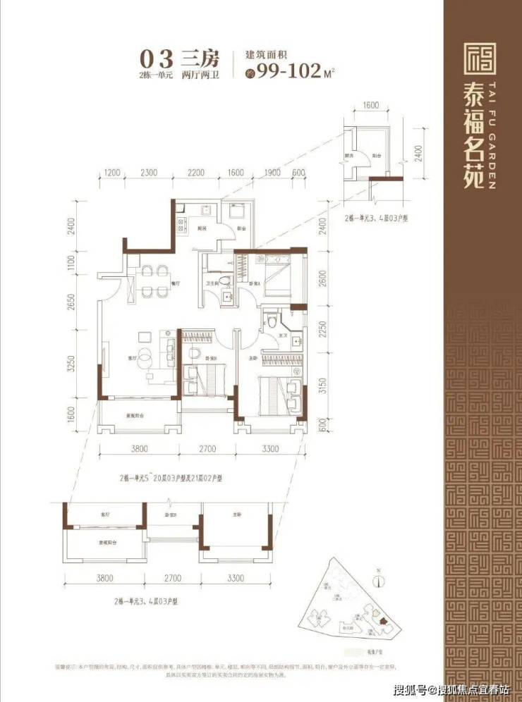90-102㎡的3房2厅2卫户型。这几个户型都是在主人房多设计一个卫生间,私密性更强,也让家人间的生活更加方便。