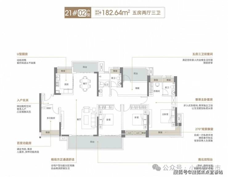 182㎡四房双套间:五开间朝南,主卧270°转角飘窗,南北双阳台,短进深设计让阳光无死角渗透。