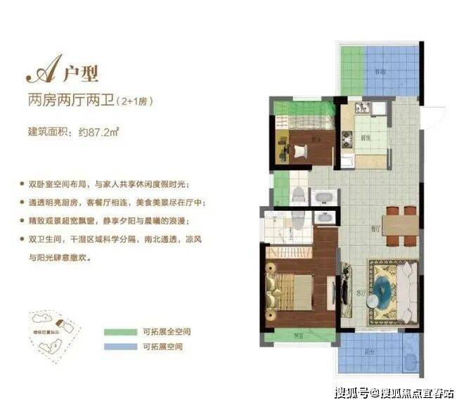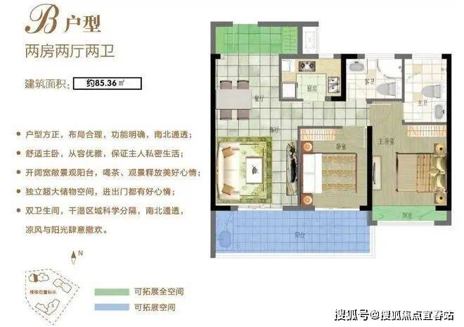B户型:85.36㎡两房两厅两卫