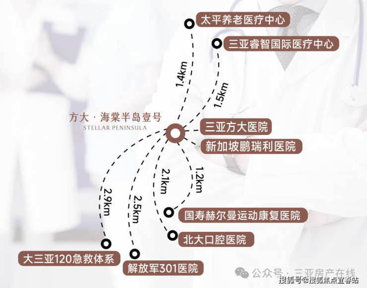 汇聚解放军总医院海南分院、北大口腔医院三亚分院、国寿赫尔曼康复中心、上海嘉麓医院三亚医院(规划中)、方大医院(2026年开工)等顶级医疗力量,串联成全球顶级医疗资源聚合带。