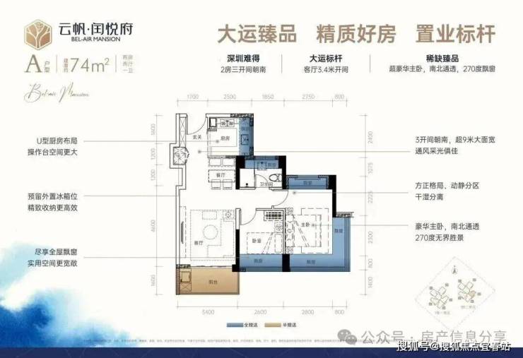74㎡2房2厅1卫:设计的是经典竖厅格局:,进门入户玄关,S墙预留冰箱位,客厅3.4米开间,U型厨房,三开间朝南,主卧南北通透270度景观,卫生间干湿分离。