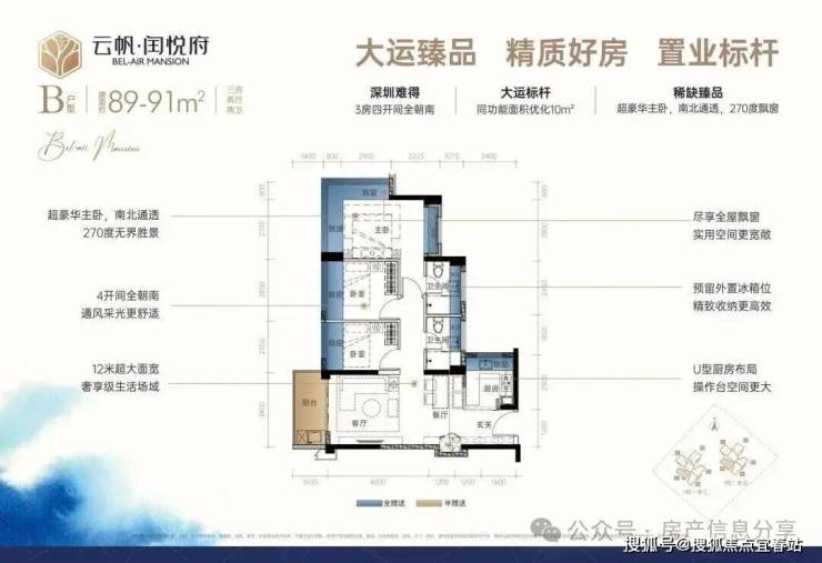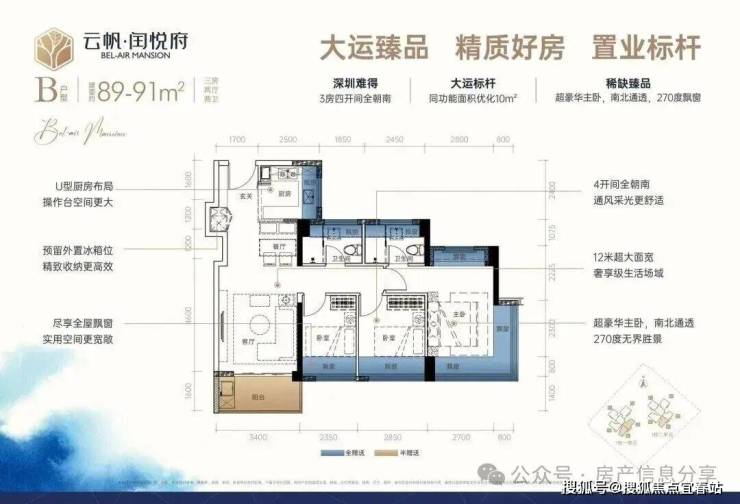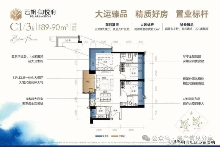 89㎡3房2厅2卫:设计的是经典横厅格局,LDKB一体化,进门入户玄关,客厅带3.5米阳台,U型厨房,主卧南北通透270度景观,卫生间干湿分离。