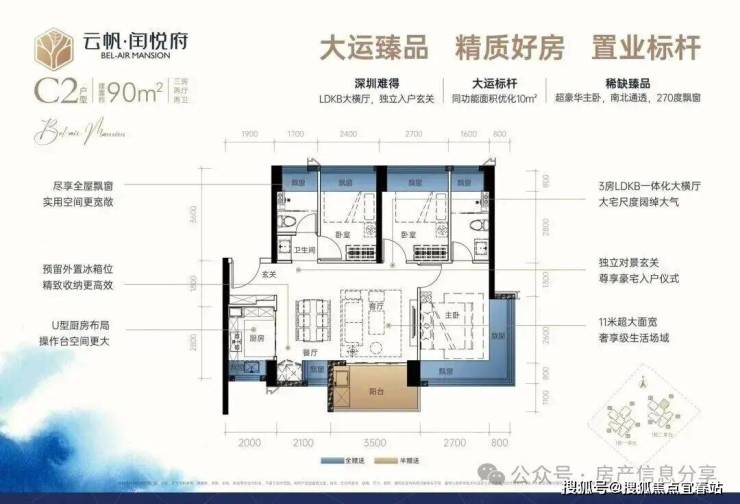 90㎡3房2厅2卫:设计的是经典横厅格局,LDKB一体化,进门入户玄关,客厅带3.5米阳台,U型厨房,主卧南北通透270度景观,卫生间干湿分离。