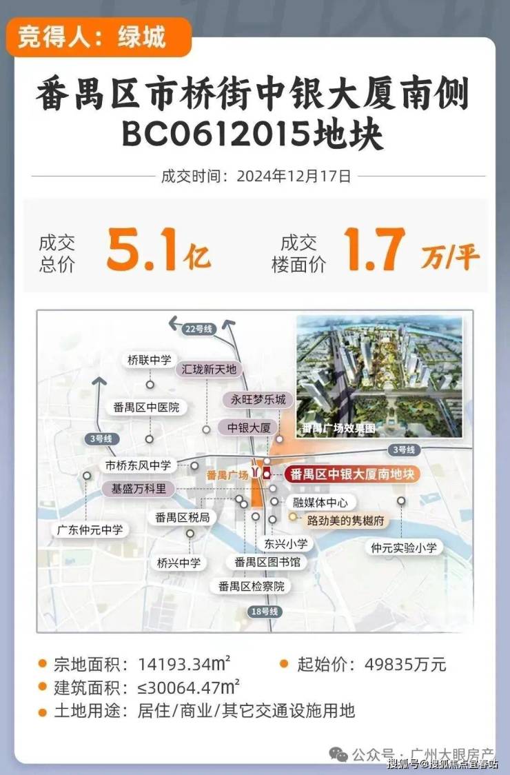 番禺2024年底王炸,正式拍出!2024年12月17日绿城拿下番禺广场中银南侧地块,总价5.08亿,楼面价1.7万/平!(未扣除配建,按总建面计算),地块北侧,就是广州赫赫有名的蟑螂大厦——中银大厦