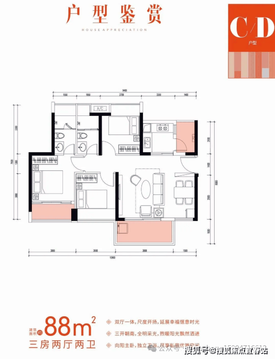 建面约88㎡3房2厅2卫:宽敞明亮,适合有小孩或老人的家庭。