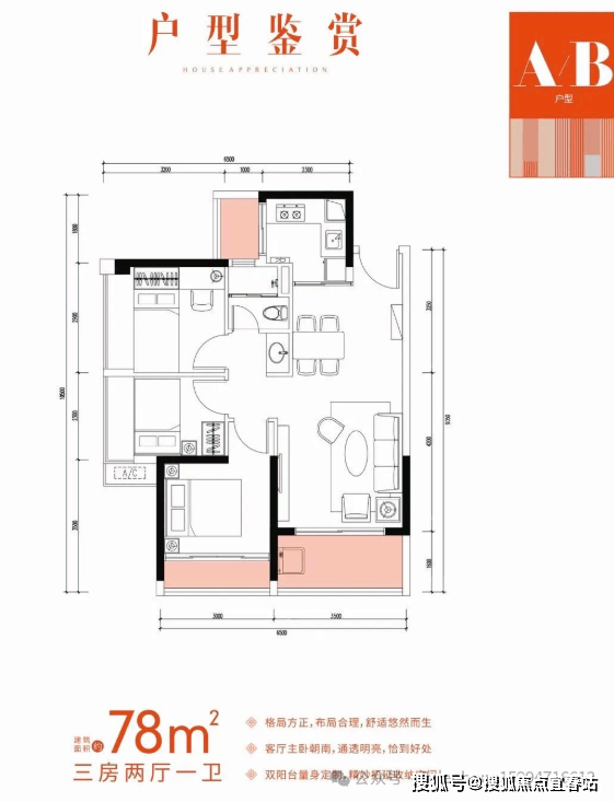 建面约78㎡3房2厅1卫:空间布局合理,满足三口之家的居住需求。