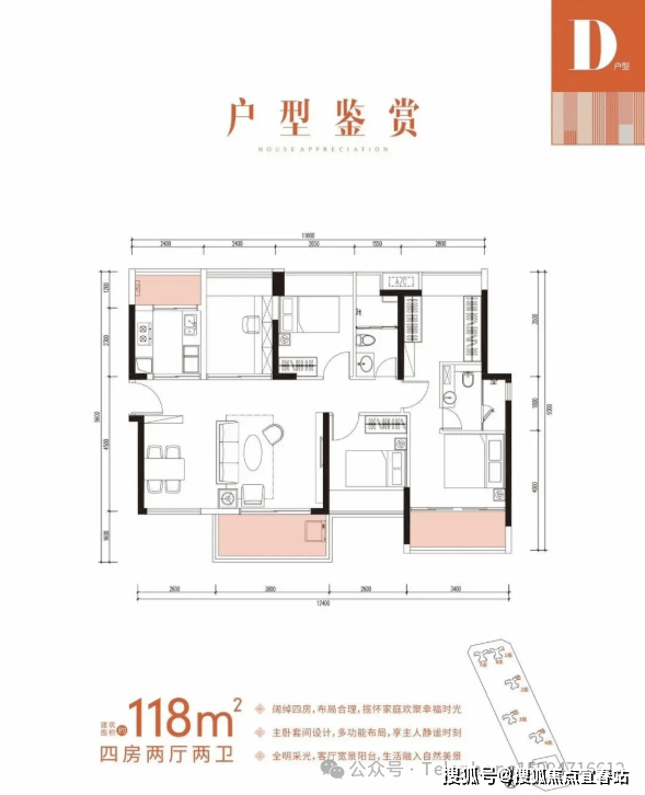 建面约118㎡4房2厅2卫:四房设计,满足多口之家的居住需求,南向阳台尽享阳光生活。