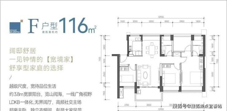 116㎡的4房2厅2卫,F户型,设计的是竖厅南北通透格局,餐客厅一体化设计,客厅3.8米开间,四开间朝南,4个卧室分别做到了主卧18.02㎡/次卧12.3㎡/次卧8.7㎡/次卧8.37㎡(包含墙体飘窗),都不用搭配飘窗做床,L型厨房,卫生间干湿分离,得房率约:88%(包含赠送),阳台主朝西南或东南向。