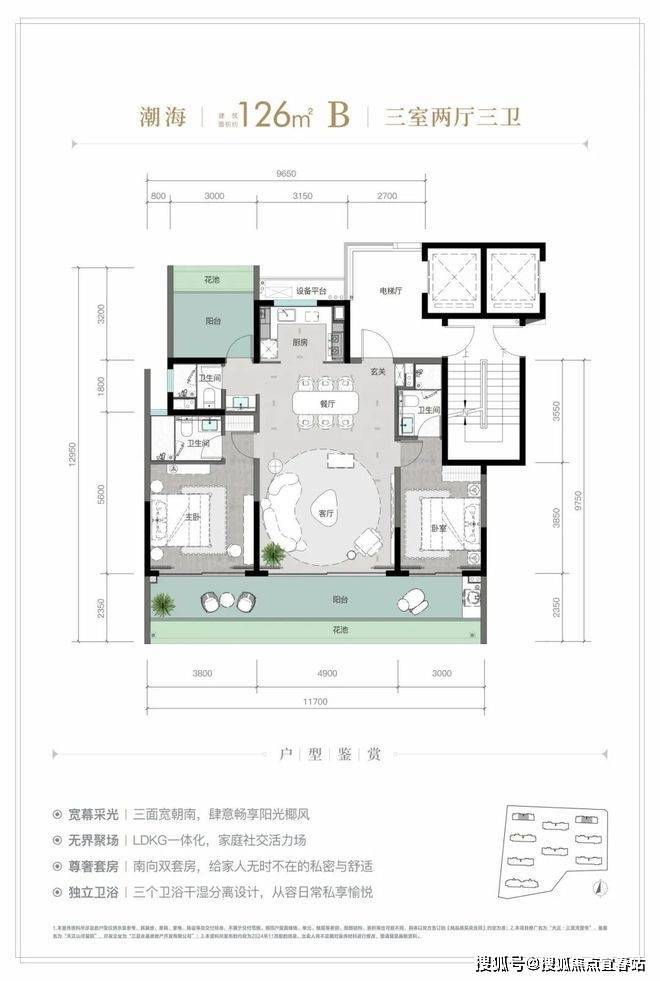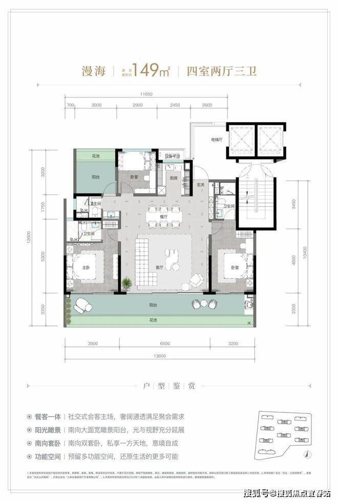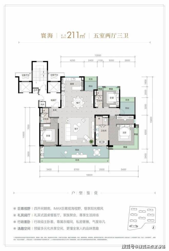 规划建筑面积约126-213㎡观海奢装大平层,约3.1米阔绰层高,部分户型创新设计270°全景飘窗主卧套、四开间朝南等,全成品高标奢装,营造全新舒居体验。