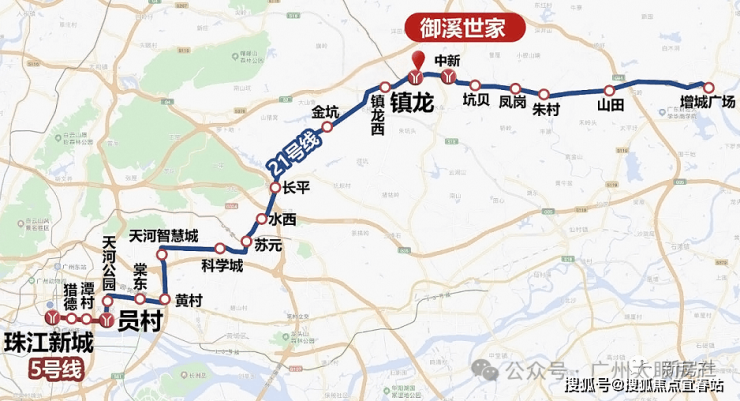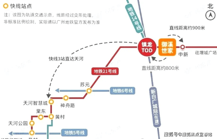 距离地铁21号线中新站(约1000米)、地铁14/21号线镇龙站(约1000米),快线3站到天河,7站到珠江新城。