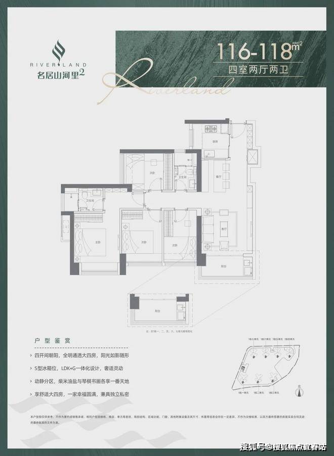 116-118㎡的4房2厅2卫(04户型),设计的是竖厅格局,客厅3.7米开间,S墙设计预留冰箱位,四开间朝南,U型厨房,得房率:73.85%(不含赠送),阳台1.5米进深,东南向。