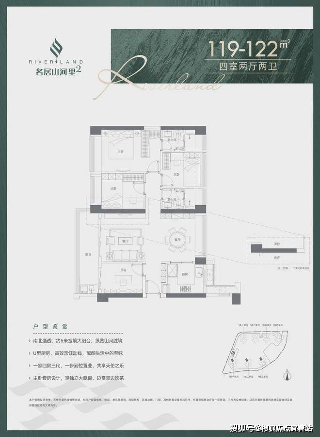 119-122㎡的4房2厅2卫,设计的是竖厅南北通透格局,客厅3.8米开间,四开间朝南,全屋飘窗,U型厨房,得房率:74.83%(不含赠送),阳台1.5米进深,6米长超大阳台,主朝西南向。