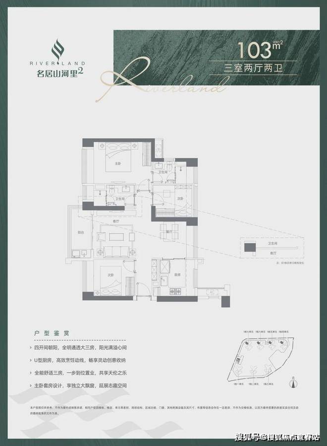 103㎡的3房2厅2卫(02户型),设计的是竖厅南北通透格局,客厅3.5米开间,四开间朝南,全屋飘窗,U型厨房,得房率:73.87%(不含赠送),阳台1.6米进深,主朝西南向。
