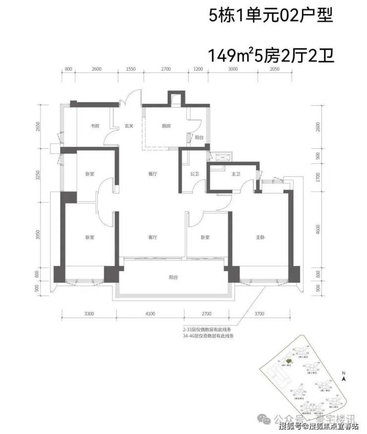 【五栋一单元-平面图】3梯3户,3条腿,分别是01、03号房户型约173㎡的5房2厅2卫、02号房户型约149㎡的5房2厅2卫