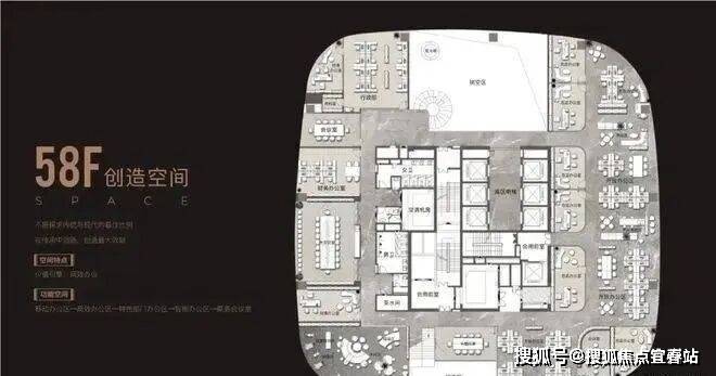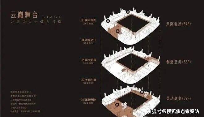 备注:57、58、59楼是顶层复式,可做企业会馆、会所等,云端共享办公、总裁私密办公区、商务接待区、总裁级私密接待区、西餐厅、酒吧等应有尽有!