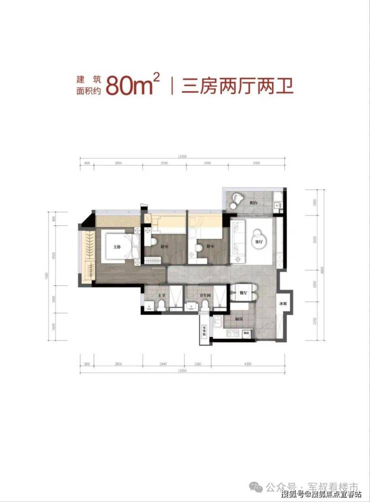 • 建面约80㎡的三房两厅两卫