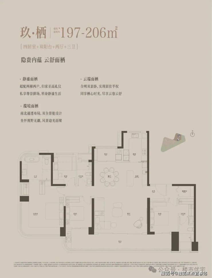 197㎡四房三卫,折后总价区间973-1262万,单价区间4.93-6.39万/㎡;