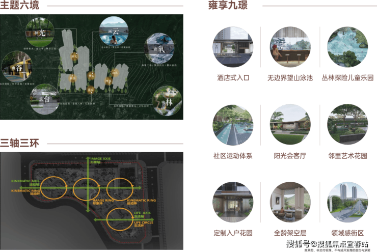景观园林以“借山还山,师法自然”为设计理念,以“三轴三环”为结构,以”六境九璟“为核心景观主题,打造约2万㎡全龄乐活生态公园。