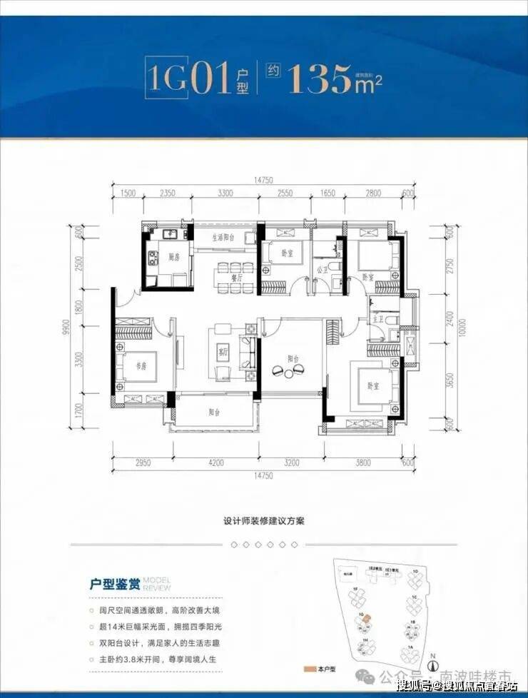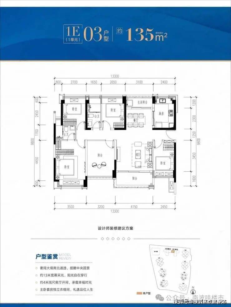 135平5房2卫,南北通透双阳台,东南朝向看花园,赠送面积21.51-21.8㎡,加赠送得房率约95.56-95.78%。