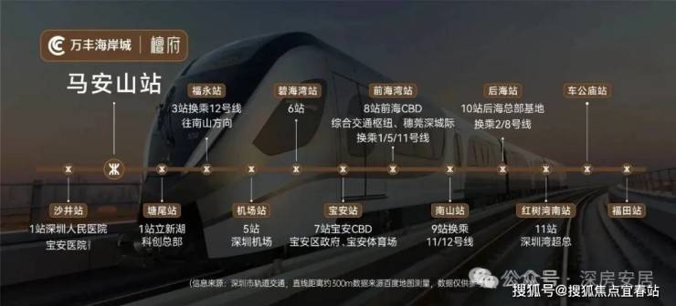 地铁配套:万丰海岸城檀府的交通配套极为便捷,形成了"地铁+公交+自驾"三位一体的立体交通网络。地铁方面,项目距离11号线马安山站直线距离约300-600米,步行3-5分钟可达,该站设有D出口直接连接项目,且站内设有母婴室、无障碍通道等人性化设施。11号线可与深圳地铁1号、2号、3号、5号、6号、7号、9号、12号等8条线路直接换乘,半小时可达宝安机场,40分钟可到南山科技园,50分钟可达福田中心。