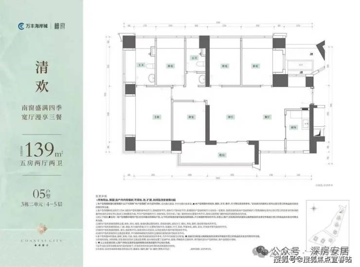 139㎡的5房2厅2卫,设计的是横厅南北通透格局,客餐厅6.25米开间,LDKB一体化,全屋12面飘窗,U型厨房,公卫三段式干湿分离,得房率约100%(包含赠送),客厅连接次卧出6.8米长的观景大阳台约11.9m²东南朝向。赠送面积约29.47m²。