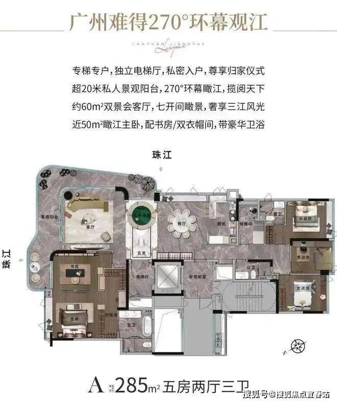 项目规划低密度18层,一梯一户,270°全景视野,拥享三面环江震撼景观。目前只做了两种户型:193㎡和285㎡江景大平层。