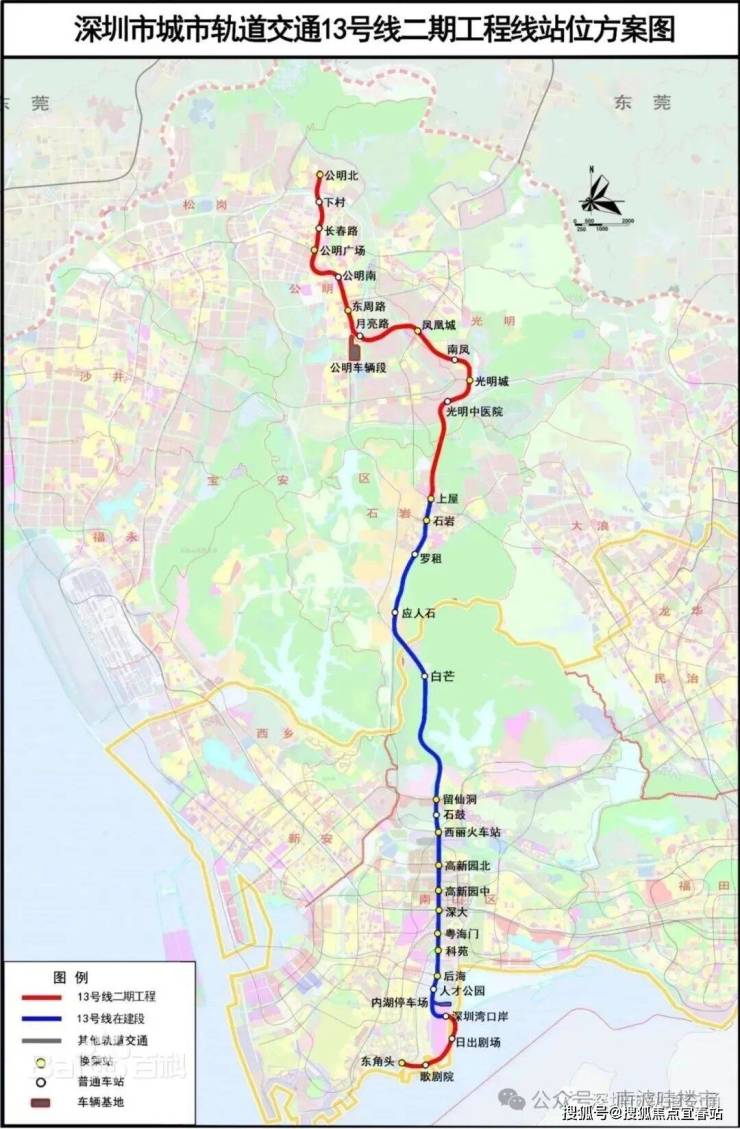 ①13号线及其南、北延长线(建设中,预计2025年开通)起于东角头站,终于公明北站,纵贯光明、宝安、南山,线路开通后约30分钟可抵达南山核心区,约45分钟可达深圳湾口岸,以高新技术人才为主要客流,被称为高新技术人才专线