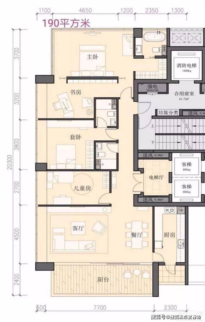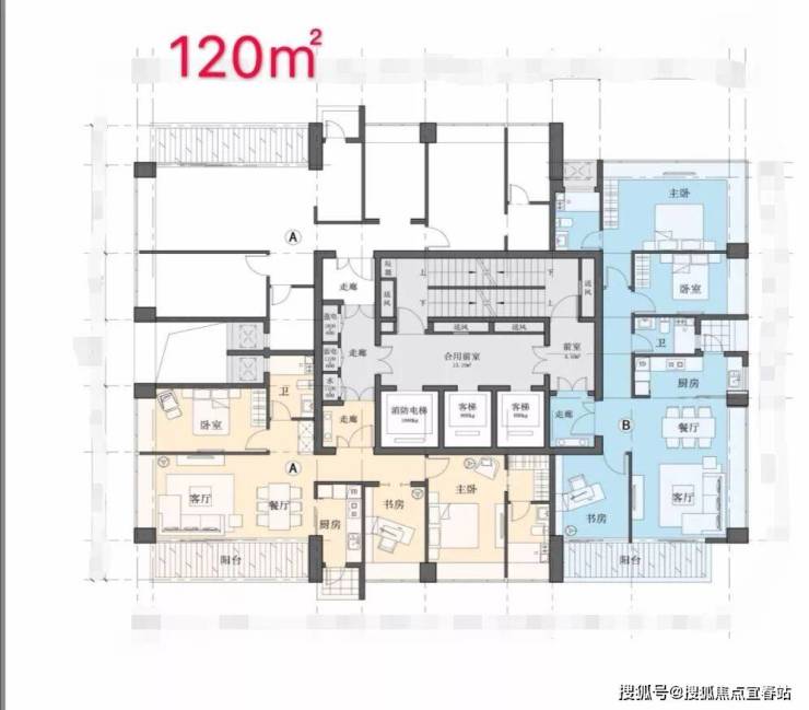 中间同高,43层。三梯三户,全部120的户型,三房,72%使用率。120三房,也非常舒适的尺度了。