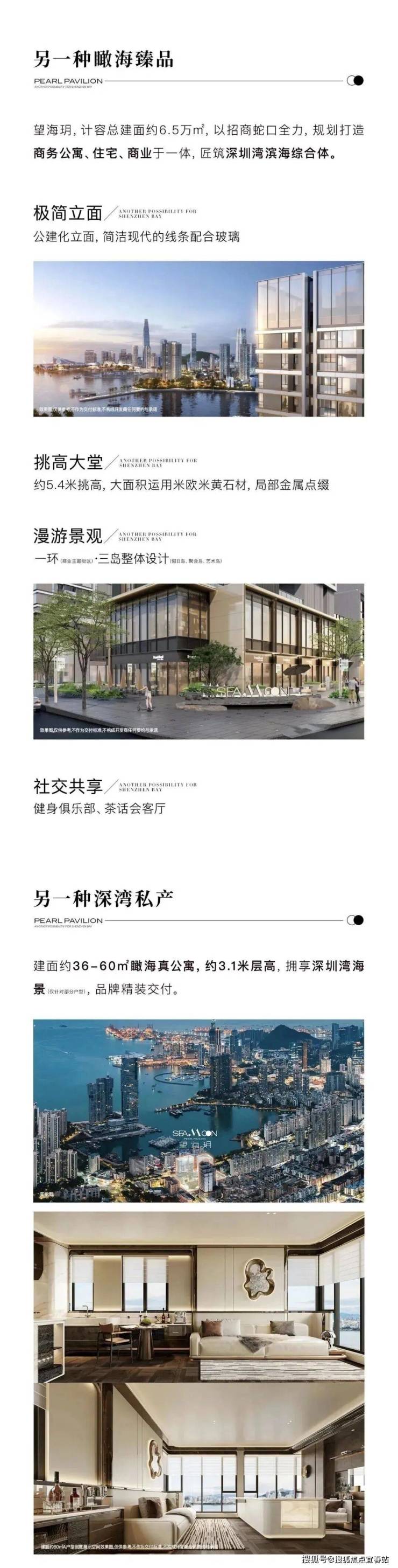 项目拥开阔山海景观,推窗即揽海景与山景,周边海上世界商圈、蛇口沃尔玛、蛇口人民医院等醇熟配套环伺,满足多元生活需求。主推 36-60㎡瞰海公寓,户型灵动,计划申请民水民电,降低居住成本;精装交付省心,35 层建筑配 9F、22F 架空层,40% 绿化覆盖率提升居住舒适度,约 450 个车位充足。